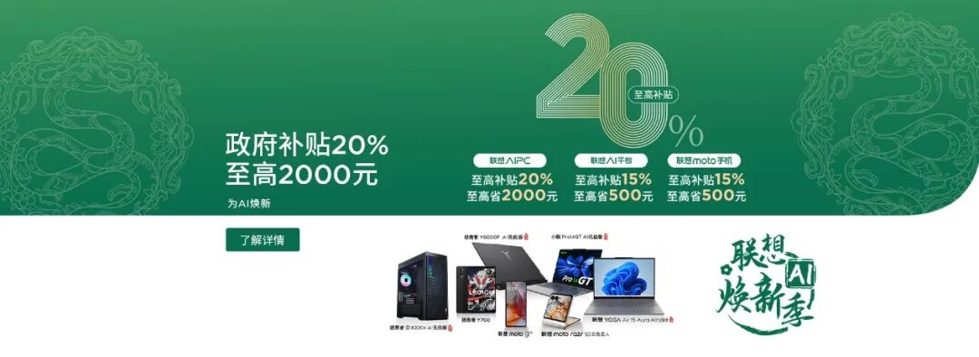 政府补贴与诚意优惠也彰显联想让利的坚定决心,焕新季期间系列重磅福利回馈每一位用户。2月10日至3月2日,个人用户购买联想AI PC享政府补贴立减20%,最高立省2000元;AI手机、平板直降15%,搭配购买配件5折起,从鼠标、充电宝到智能办公套装,让科技真正融入生活。联想官网用户还可限时抢88元红包,Lenovo Care服务低至99元起,叠加抽奖福利可赢联想moto手机、10g金条等超值好礼。