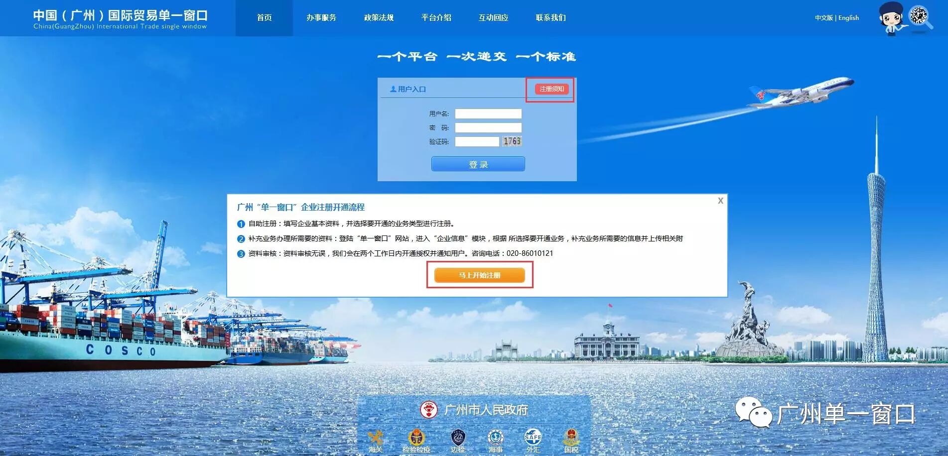 答:登录网址(www.singlewindow.gz.cn),点击“注册须知”,在“广州‘单一窗口’企业注册开通流程”框内,点击“马上开始注册”,进行“用户注册”环节操作,并按照“用户注册”—“补充业务办理所需要的资料”—“资料审核”流程完成注册。