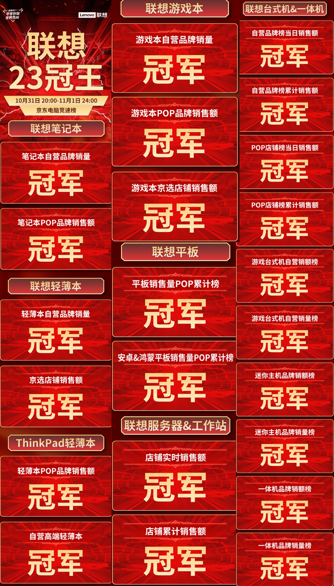 2024年双十一大战正酣,各大商家奇招频出,不断加码好物及钜惠福利,上演了一场精彩的大比拼。联想在11月1日捷报频传:10月31日20时-11月1日24时,联想在京东11.11电脑竞速排行榜中斩获23项冠军,包括自营品牌销量榜、品牌京选店铺销额榜等多个榜单均位居第一,特别是在轻薄本、游戏本等榜单中,联想表现尤为突出。