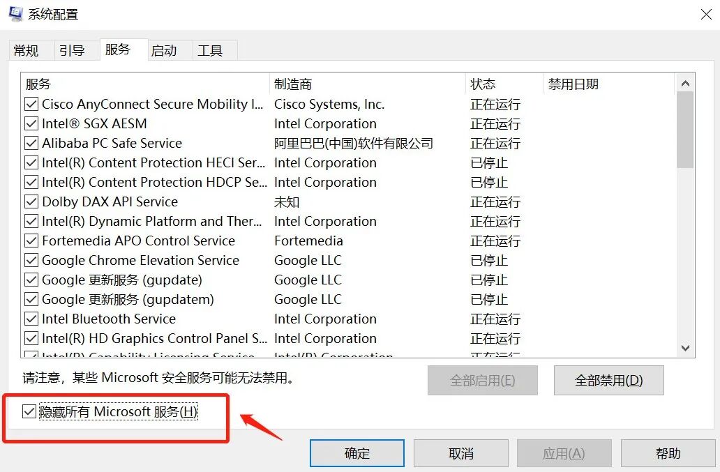 ②使用软件关闭启动项;③开始-右键-运行,输入msconfig,单击【启动】和【服务】关闭和禁用相应进程,如下图 (注:勾选【隐藏所有Microsoft服务】,以避免错误关闭系统服务导致错误发生。)