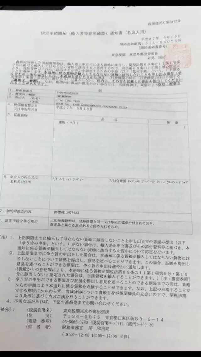 随着网络的发展网购更是成为现在生活的一部分,网络销售的物品也可能是由国外发送到日本。商品在进入日本时被检验判定为假货便会直接被日本海关没收,由海关发送一封认定手续通知书(如上图)上面会有详细的货物信息内容。会有一栏【知的財産の内容】里面记载的就是正品注册的商标权番号。而进行认定手续的理由会记载实际商品与注册品牌商品不符。
