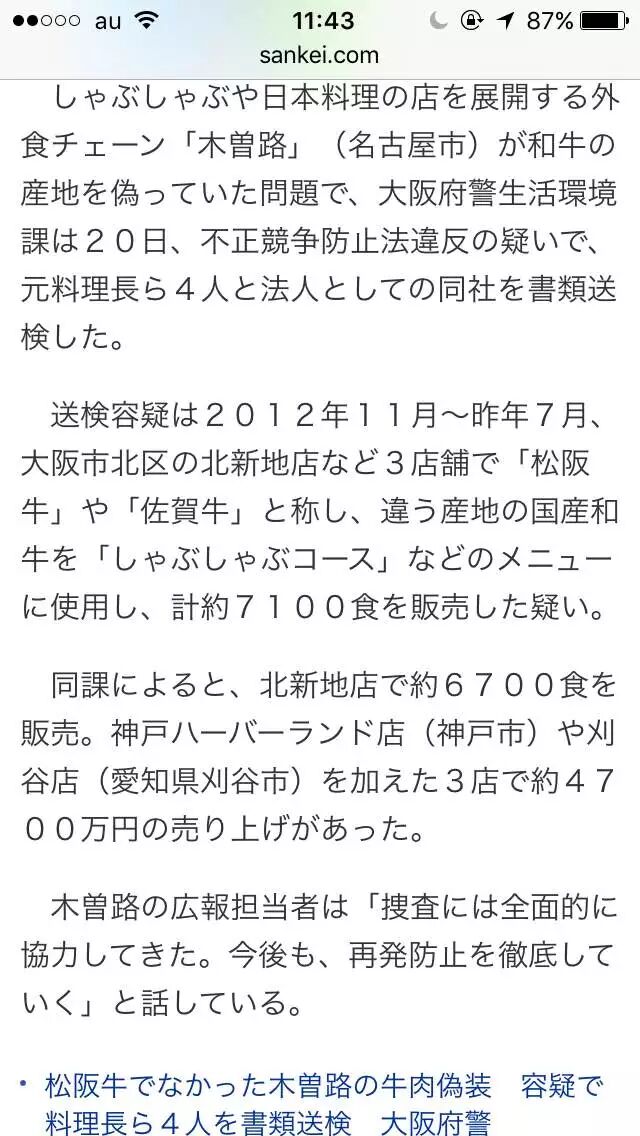 事情是这样的---木曽路于2012年4月到2014年7月期间销售提供给顾客,菜单中标记为“松阪牛”牛肉并非松阪牛,而是無銘柄和牛。虽然都属日本最高级的和牛,但涉及产地造假。