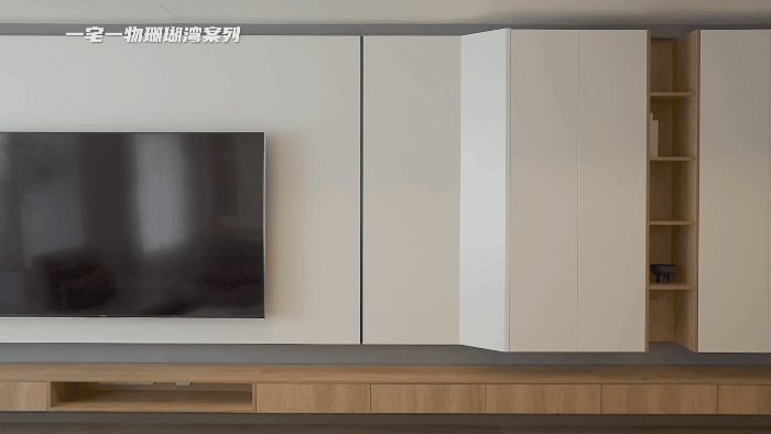 在这个设计里,英麒考虑到户主比较喜欢投影观影的方式,于是便在房间的一整面墙都设计成了纯白色的收纳柜,既不妨碍日常的投屏观影,又不妨碍衣物收纳。同时考虑到房间的空间较小,英麒团队将屋里的阳台包入室内,从而让客厅看起来非常大。