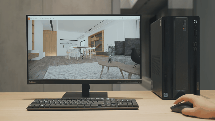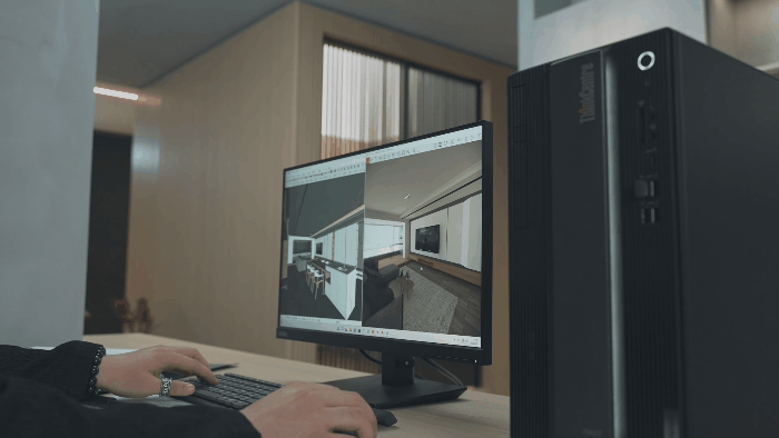 在这个过程中,客户可能会有些自己的需求,比如吊顶太低希望高一点,电视不要支架要壁挂,客厅的灯光......有了联想ThinkCentre neo P780的帮忙,英麒和团队可以通过Sketch UP快速地修改模型,然后再通过Enscape进行渲染。客户一杯咖啡的工夫,就能够再次看到修改后的效果。