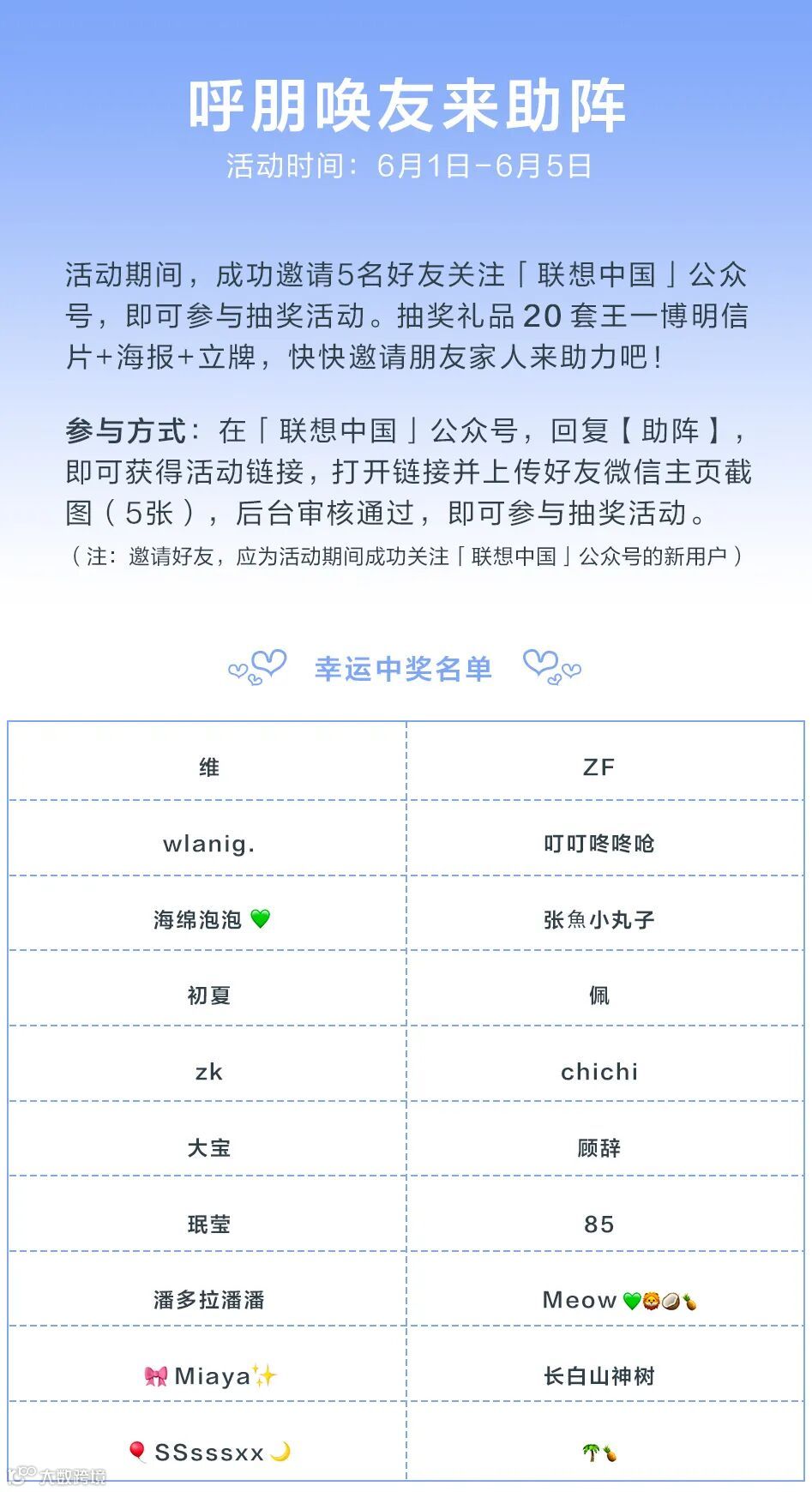 恭喜以上20名幸运用户中奖,每人获得一套王一博明信片+海报+立牌。