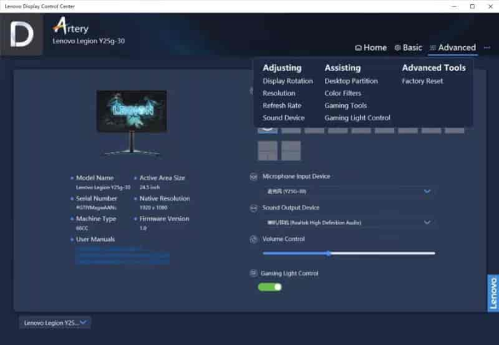 拯救者Y25还搭载了Artery软件驱动(Lenovo Display Control Center),能够帮助玩家更简单快捷的调整显示器设置,无需手动操作OSD按键。玩家只需简单动动鼠标,就能够设置显示器的显示效果、调整供电功率、切换接口信号、调节刷新率、响应时间等等,快速切换不同模式,进行个性设定。