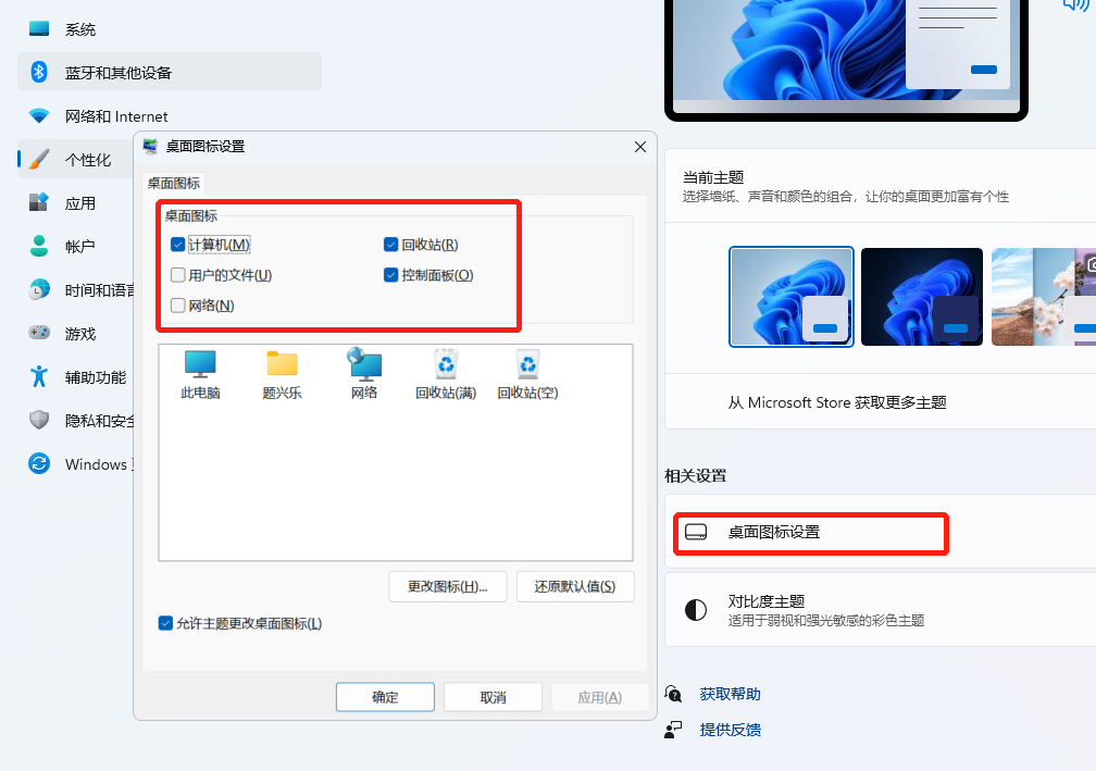 3、这时我们就可以选择自己需要的桌面图标了,将需要的桌面图标打钩后点击【应用】,再点击【确定】,再次返回桌面即可看到新增的桌面图标啦~