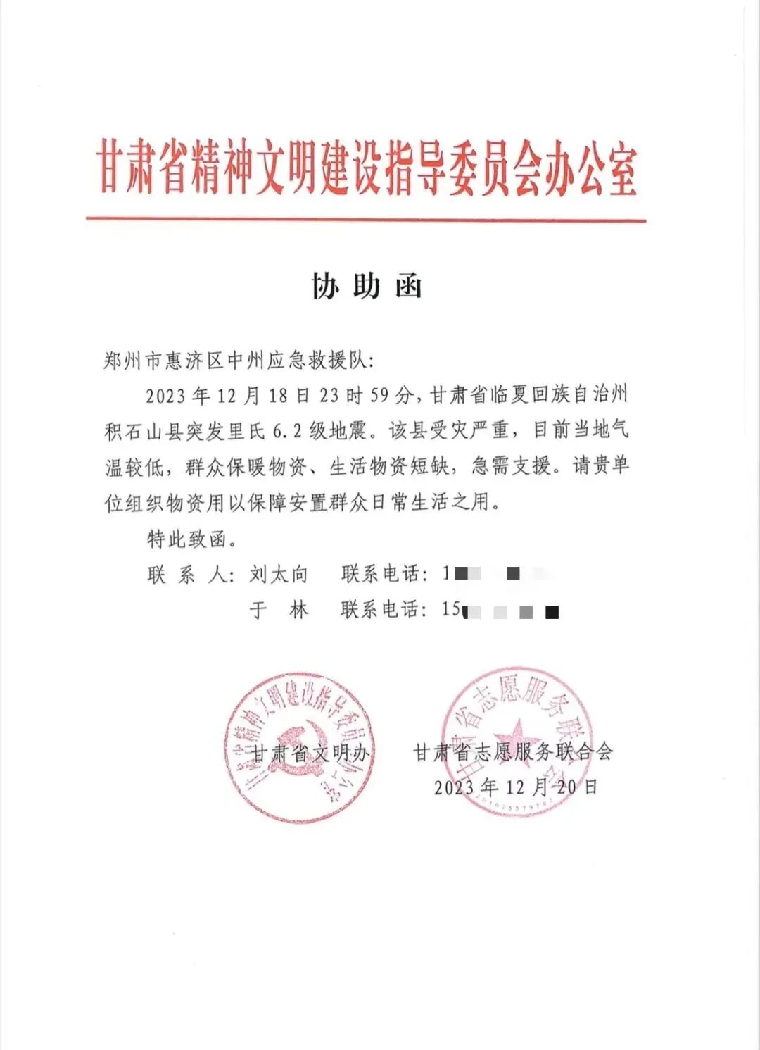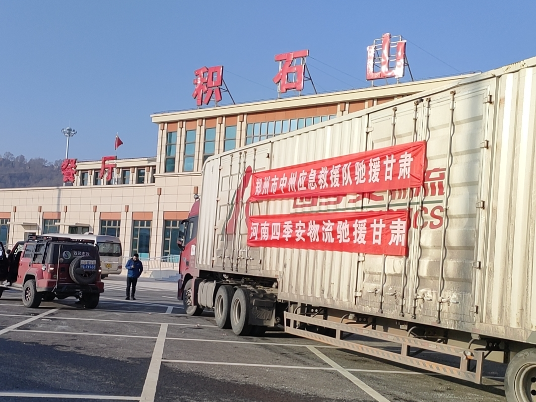 12月20日,甘肃省文明办发函求助。在郑州市委宣传部、郑州市文明办、郑州市精神文明建设指导中心的指导下,郑州市志愿服务联合会联合郑州市惠济区中州应急救援队、郑州市红十字星火志愿服务中心并联合四季安集团组织物资运输及灾区救援行动。得知情况后,四季安物流迅速响应,快速抵达物资点完成装车,连夜赶赴甘肃,将承载着河南人民共同捐助的爱心棉衣、棉被等过冬物资运送至千里之外的甘肃人民手中。
