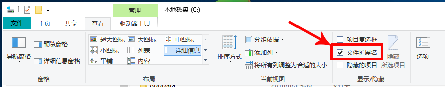 如果后缀名是隐藏状态,可打开任何一个盘符,如C盘,点击菜单栏【查看】,勾选☑️【文件扩展名】。