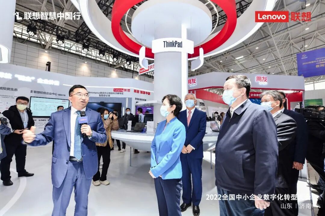 在大会创新成果展现场,山东省委副书记、省长周乃翔,工信部副部长徐晓兰,山东省副省长凌文,工信部中小企业局局长梁志峰,工信部信息技术发展司副司长王建伟(主持工作),山东省工信厅党组书记、厅长张海波,中国工业互联网研究院院长鲁春丛等领导莅临联想展台参观指导。