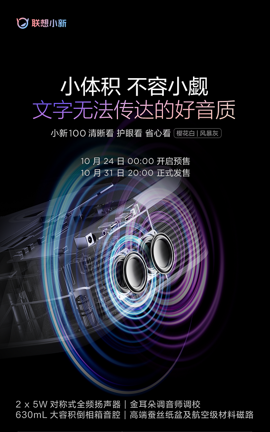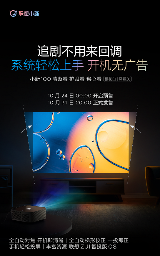 这样一款配置了全新第三代密封光机,拥有高清高亮、低噪耐用、震撼音质与智慧视觉系统的联想小新100智能投影仪,可谓是“用料十足”,诚意满满。售价1499元,首发价仅需1199元,10月24日开启预售,10月31日晚8点正式发售。