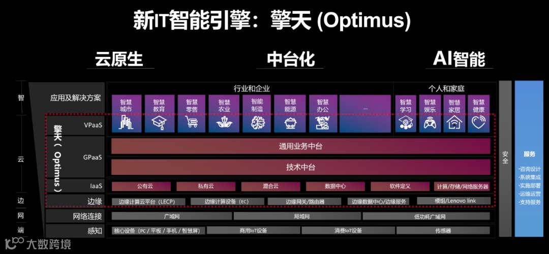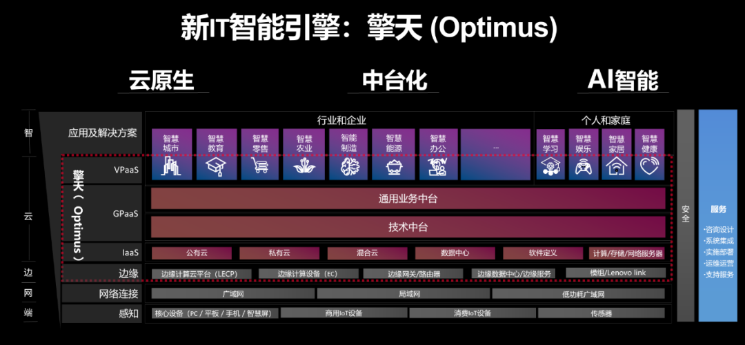 今年,联想中国区推出智能化转型新IT架构的核心引擎“擎天(Optimus)”,布局智能化转型服务落下关键一子。“擎天”,是基于“端边云网智”一体化新IT架构之上的智能IT引擎,也是联想智能化转型内生外化的重要产物。凭借着云原生、中台化、AI智能三大特征,“擎天”实现了对内驱动业务变革,对外服务客户的智能化转型的重要作用。
