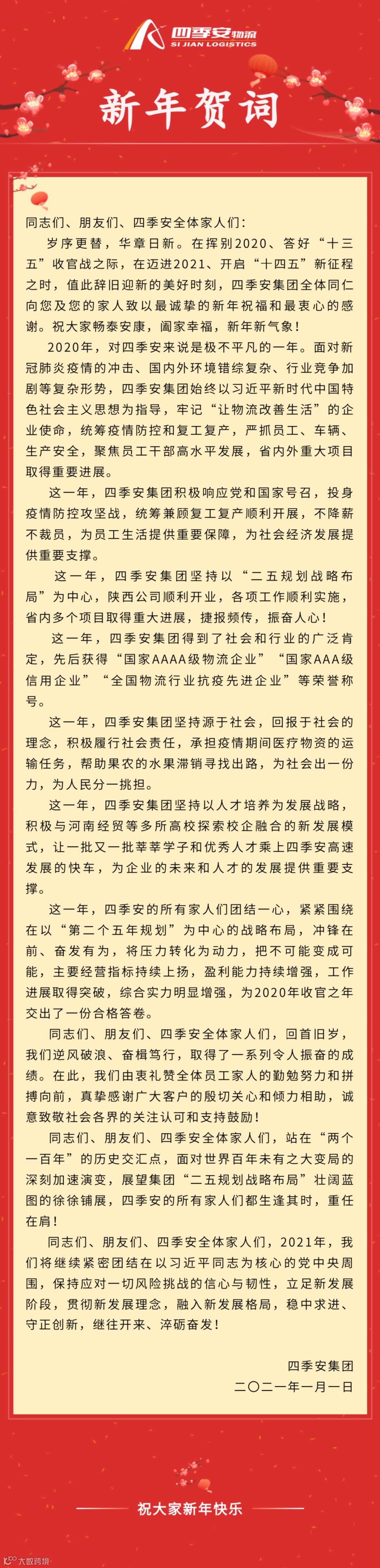 导读:2021年1月1日,四季安集团通过互联网发布二〇二一年新年贺词!