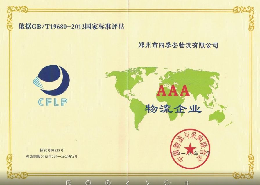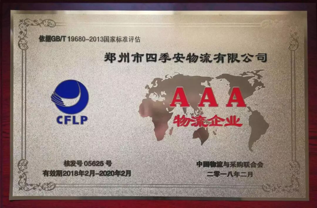 2018年4月2日,由中国物流与采购联合会主办的物流A级企业授牌大会暨物流业创新发展论坛在上海隆重举行,四季安物流获评物流企业分类“AAA级综合服务型物流企业”称号,四季安物流从此迈向国家级先进物流企业新台阶。