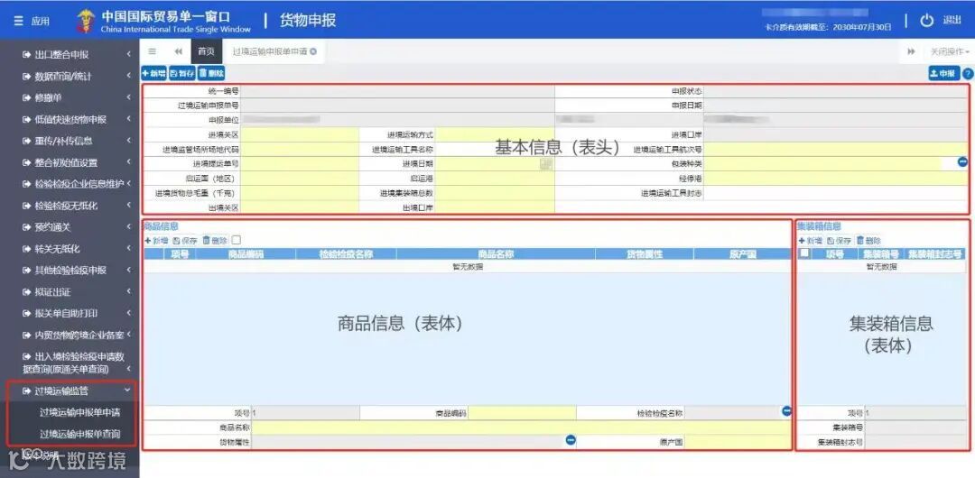 运输工具负责人向进境地海关申报过境运输申报单电子数据。
