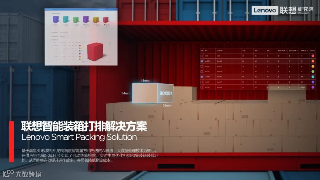 芮博还介绍了一个被他称之为“5D俄罗斯方块”的联想智能装箱打排解决方案。在物流运输中,看似简单的装箱码排问题,在传统人工进行码排或货柜装载中,不可避免地会造成空间利用率低下或轻重配比不合理,造成“飞机运棉花”的结果,导致物流成本增加。从技术角度看装箱码排问题,可以和世界上已经流行了近36年的一款游戏——“俄罗斯方块”(Teris),做一个类比。“俄罗斯方块”游戏的一个重要特点是在有限的两维或三维容器空间里有目的地放入大小不同的方块,在不断消解同色方块的过程中,保证最优的空间利用率。在这个过程中,在不能超过容器高度的约束条件下,需要考虑方向,位置,次序,相邻方块的关系等空间因素。而联想面对的装箱码排问题,除了要考虑相似的空间优化目标,还需要将轻重配比平衡作为新的优化目标。为此,联想自主研发的智能装箱打排算法考虑了长、宽、高、重量以及时间等五个因素(所以被戏称为5D俄罗斯方块),大幅提升了货运轻重配比效率,每年节省大量物流费用。