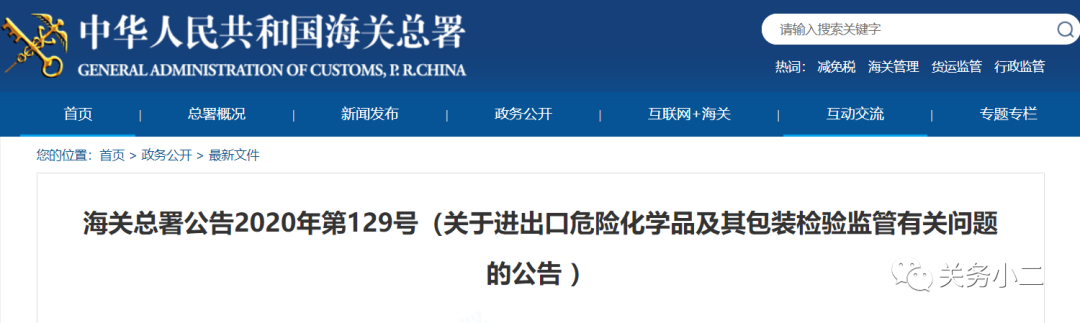 2020年12月22日, 海关总署发布2020年第129号公告,公布对进出口危险化学品及其包装检验监管新要求: