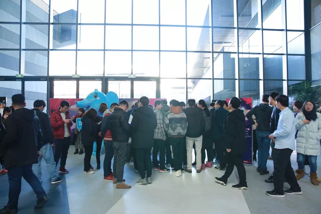 赫然看见这个叫作联萌的蓝胖子站在大厅C位,并且被比我消息还灵通的小伙伴儿们围了个水泄不通,不少小伙伴上前与联萌合影,更多的小伙伴正在前排领取定制明信片和联萌圣诞大礼包,哥当然也要蹭蹭联萌的热度和福利啊,于是见缝插针地站到联萌旁边合影:
