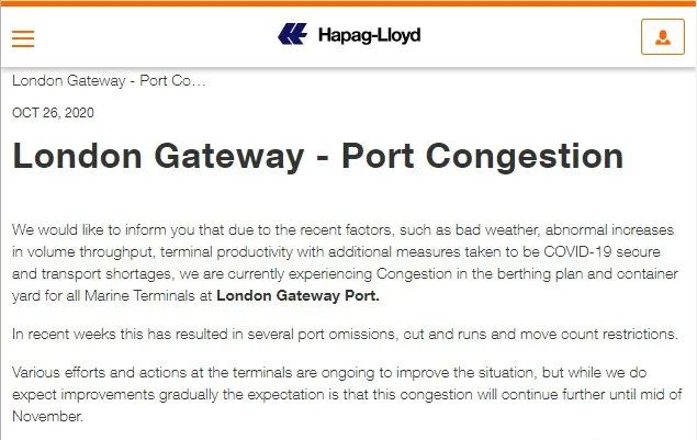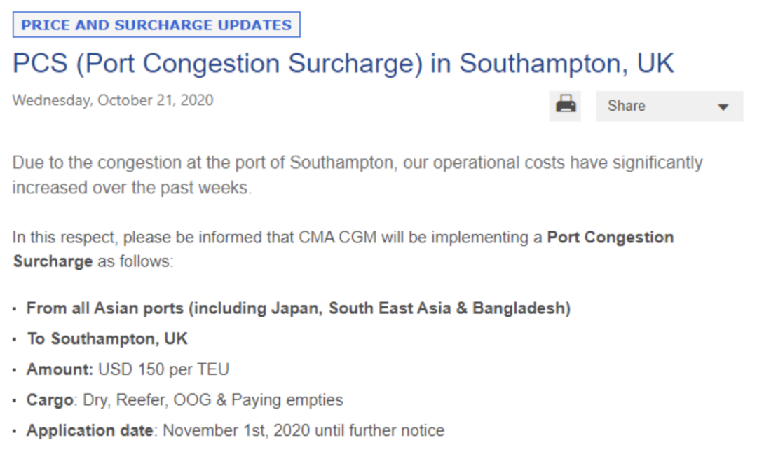 上周,达飞轮船宣布,由于南安普敦港的交通拥堵,运营成本在过去几周中大幅增加,将从11月1日起,所有从亚洲出口到南安普敦港的货物,征收150美元/TEU的港口拥堵附加费。