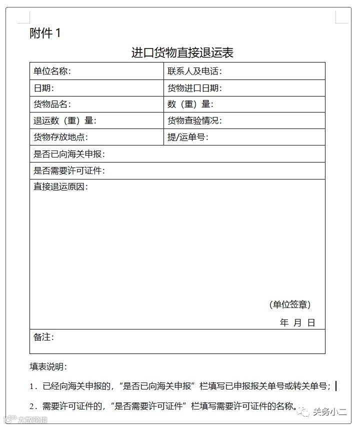 备注栏:进、出口报关单“备注”栏填报《进口货物直接退运表》或者《责令直接退运通知书》编号。