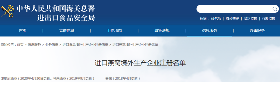 目前已获得准入的国家有马来西亚、印度尼西亚、泰国,对于已获得输华准入的燕窝国家或地区、出口企业名单等信息,海关总署定期更新并公布在官方网站上。(详见:海关总署进出口食品安全局首页 > 信息服务 > 业务信息 > 进口食品境外生产企业注册信息 > 进口燕窝境外生产企业注册名单,网址:http://jckspj.customs.gov.cn/spj/zwgk75/2706880/2811812/2811838/index.html。