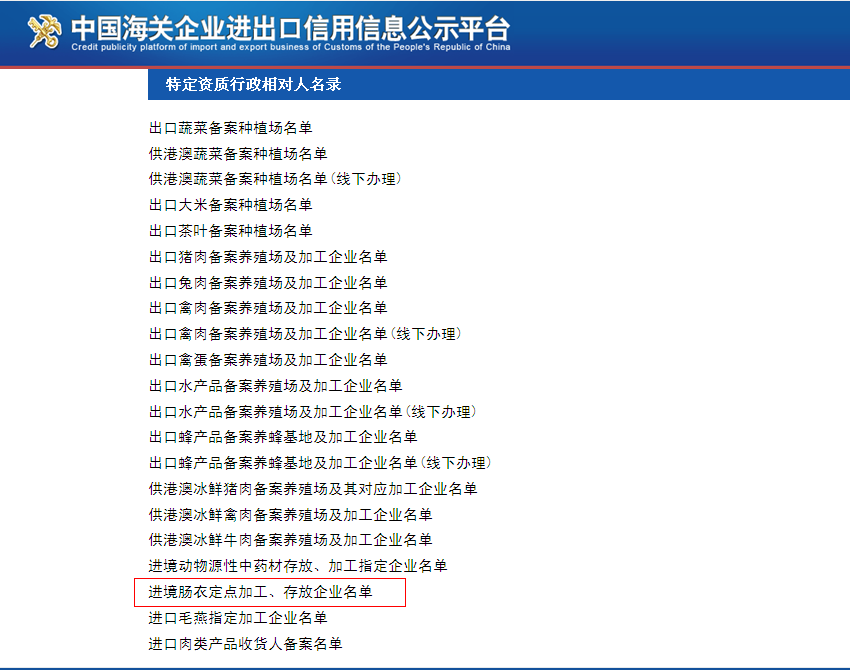 进境肠衣定点加工、存放企业应事先获得出口食品生产企业备案资质,备案范围应包括肠衣产品