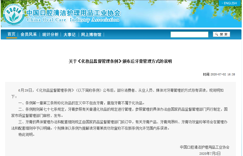 由于口腔并不在新条例化妆品定义中所列举的人体表面之列,因此牙膏不算化妆品,但其管理模式还是按照普通化妆品的规定进行,可以使用“防龋”“抑牙菌斑”“抗牙本质敏感”“减轻牙龈问题”等宣称。