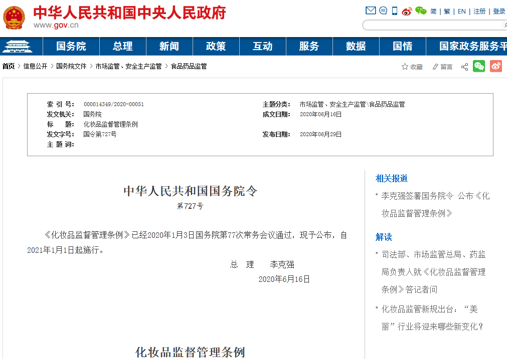 2020年6月29日,《化妆品监督管理条例》正式颁布。