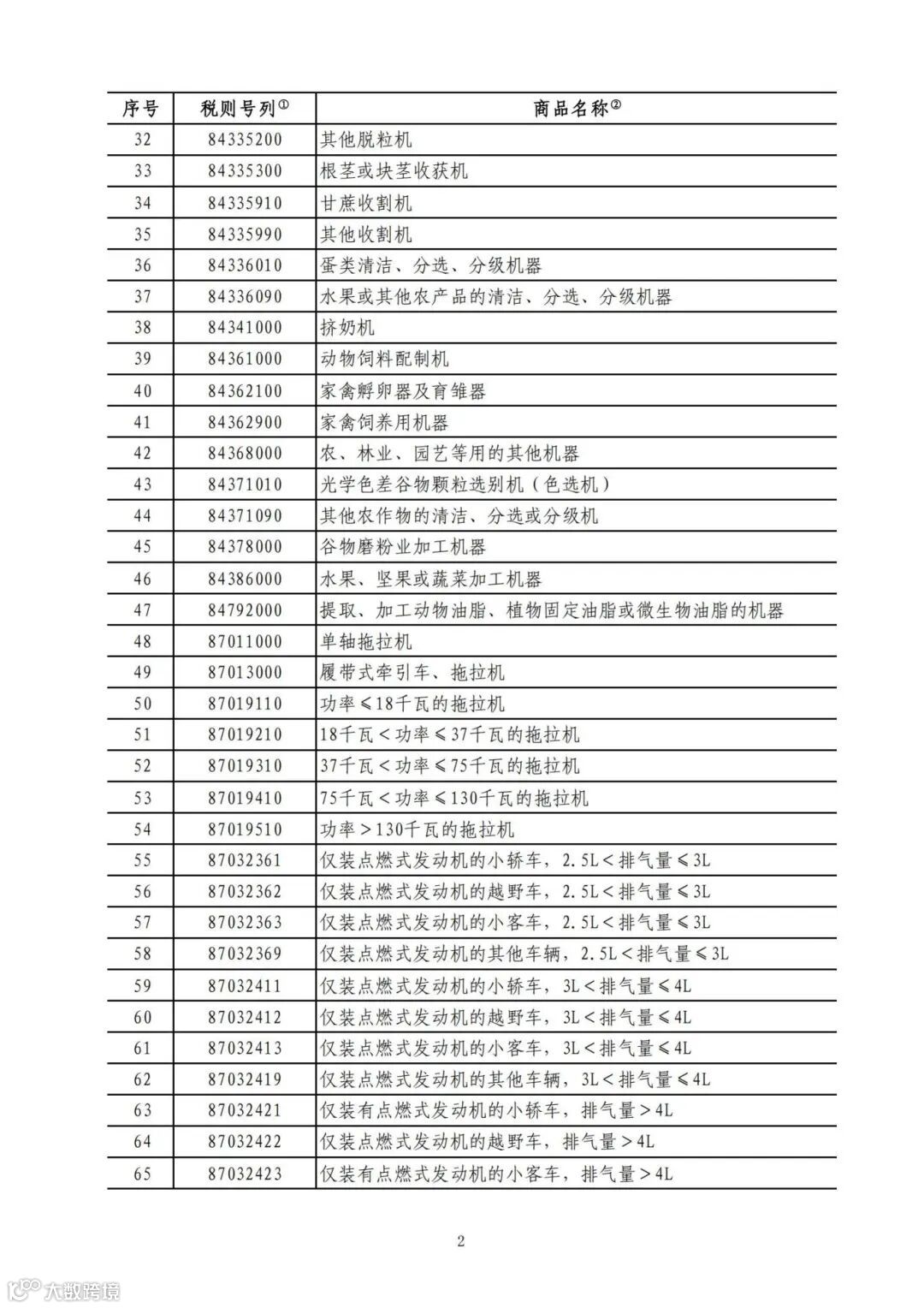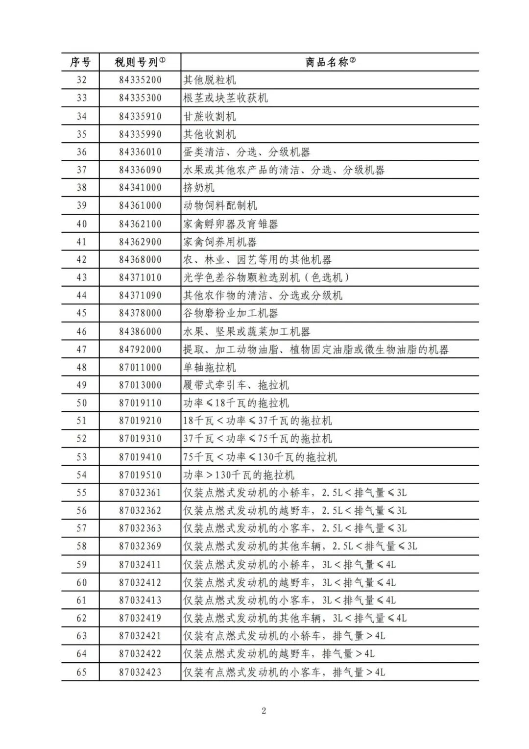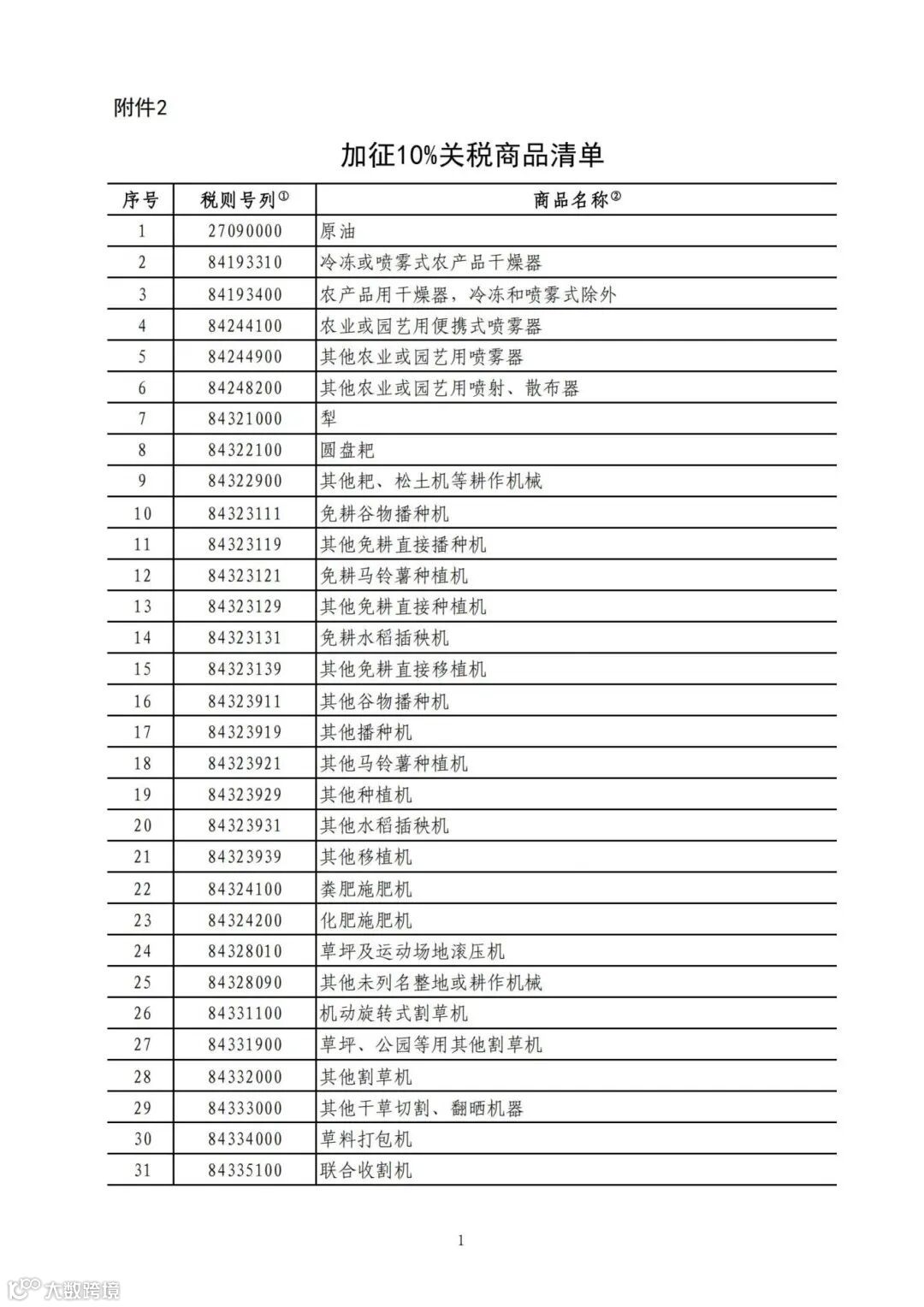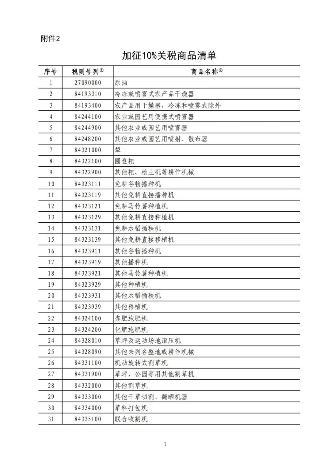 二、对原油、农业机械、大排量汽车、皮卡加征10%关税,具体商品范围见附件2。