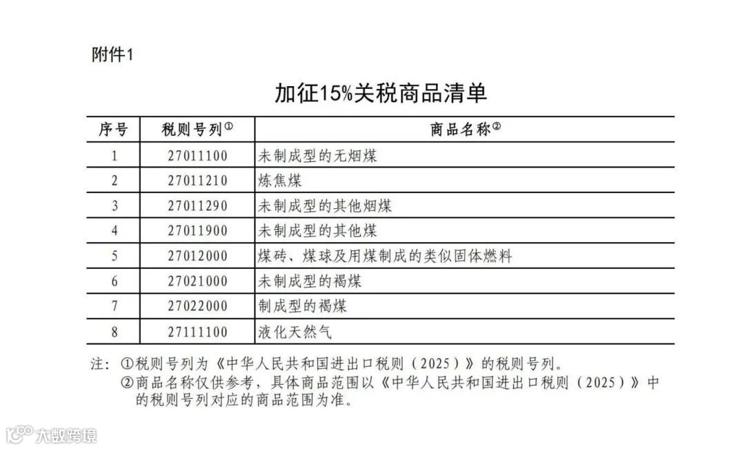 一、对煤炭、液化天然气加征15%关税,具体商品范围见附件1。