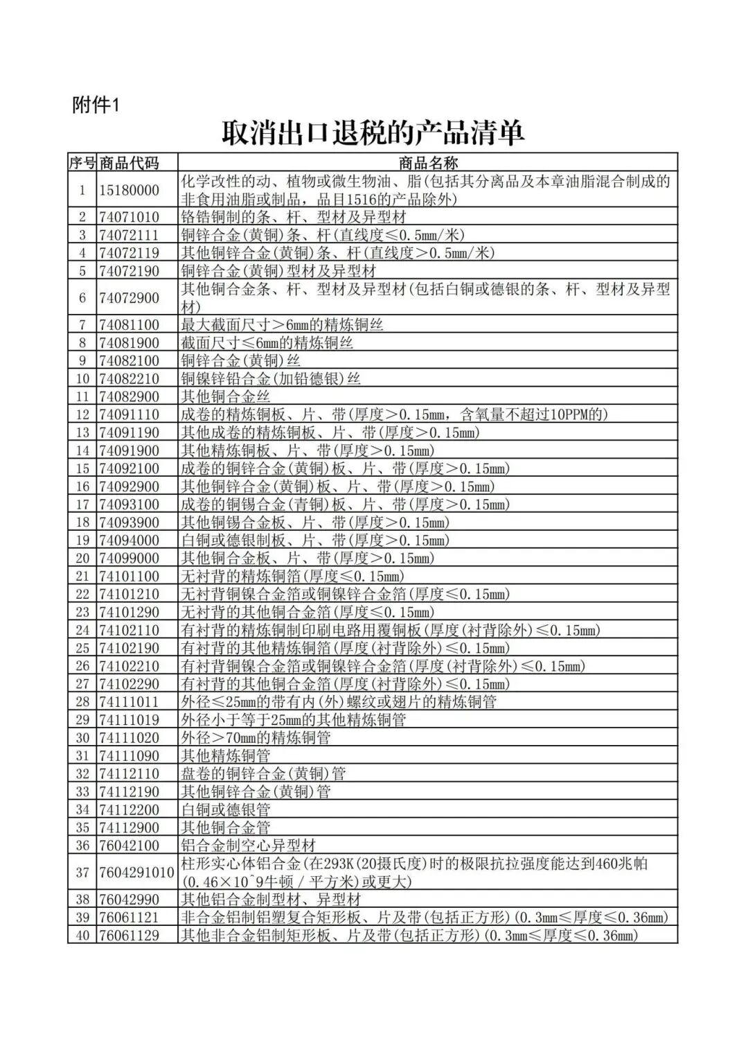 一、取消铝材、铜材以及化学改性的动、植物或微生物油、脂等产品出口退税。具体产品清单见附件1。