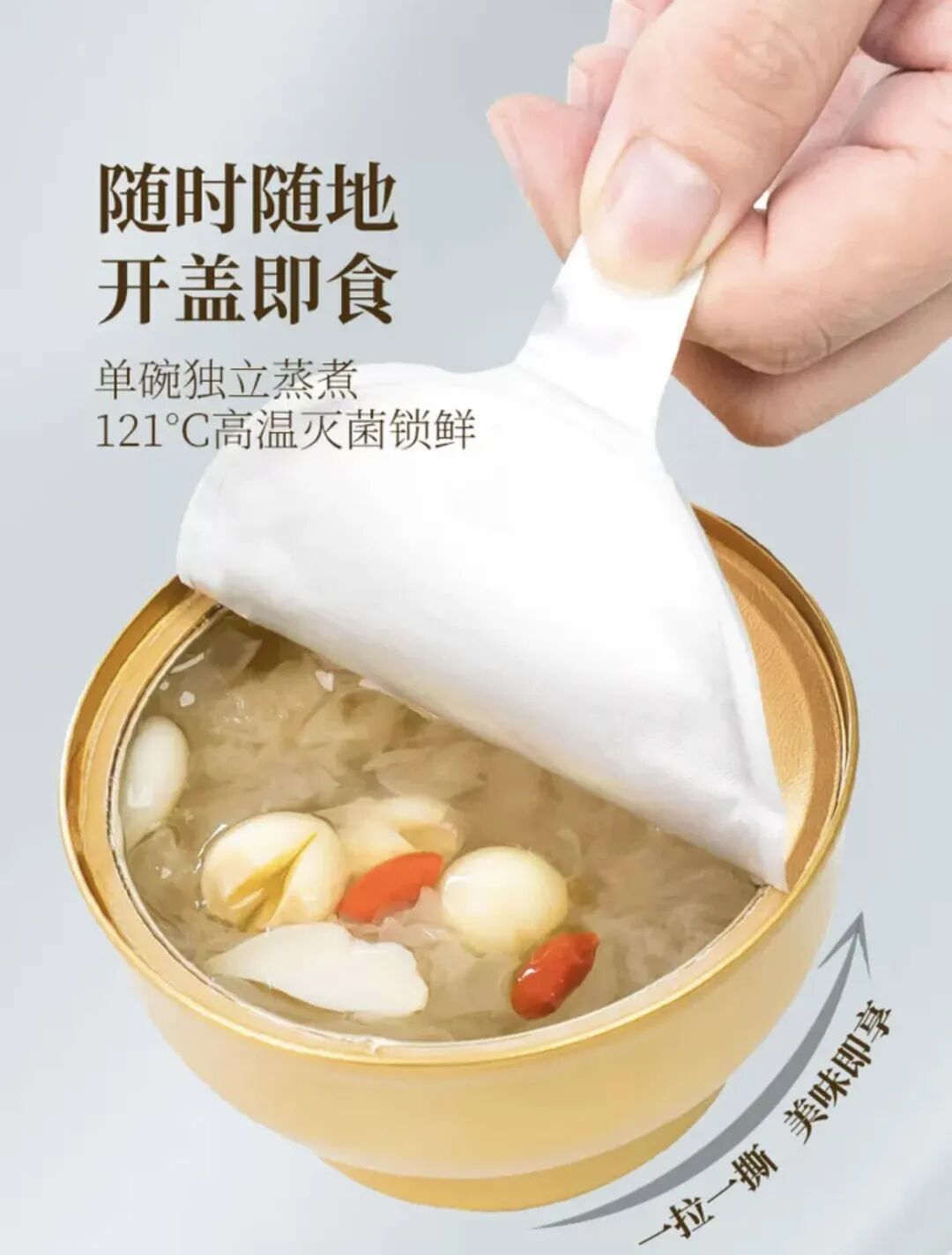 产品信息:成分含量:饮用水55%,32%银耳,冰糖8%,莲子4%,枸杞1%;生产工艺:精选优质原料-筛选清洗-单碗独立蒸煮,高温灭菌锁鲜-冷却-包装;包装规格装:248克/碗,固形物含量超过≥35%;食用方法:开盖即食,冷藏口感更佳。