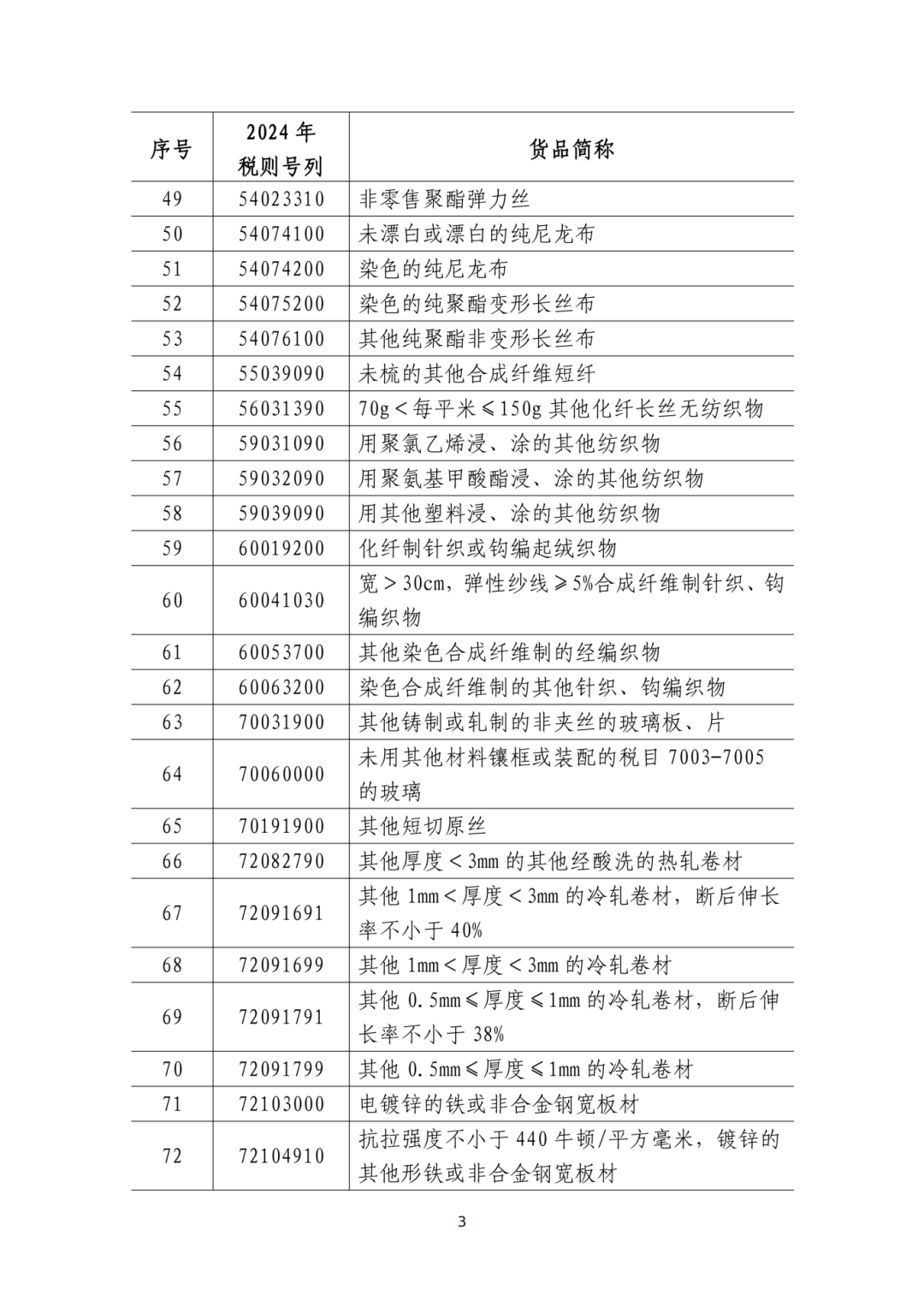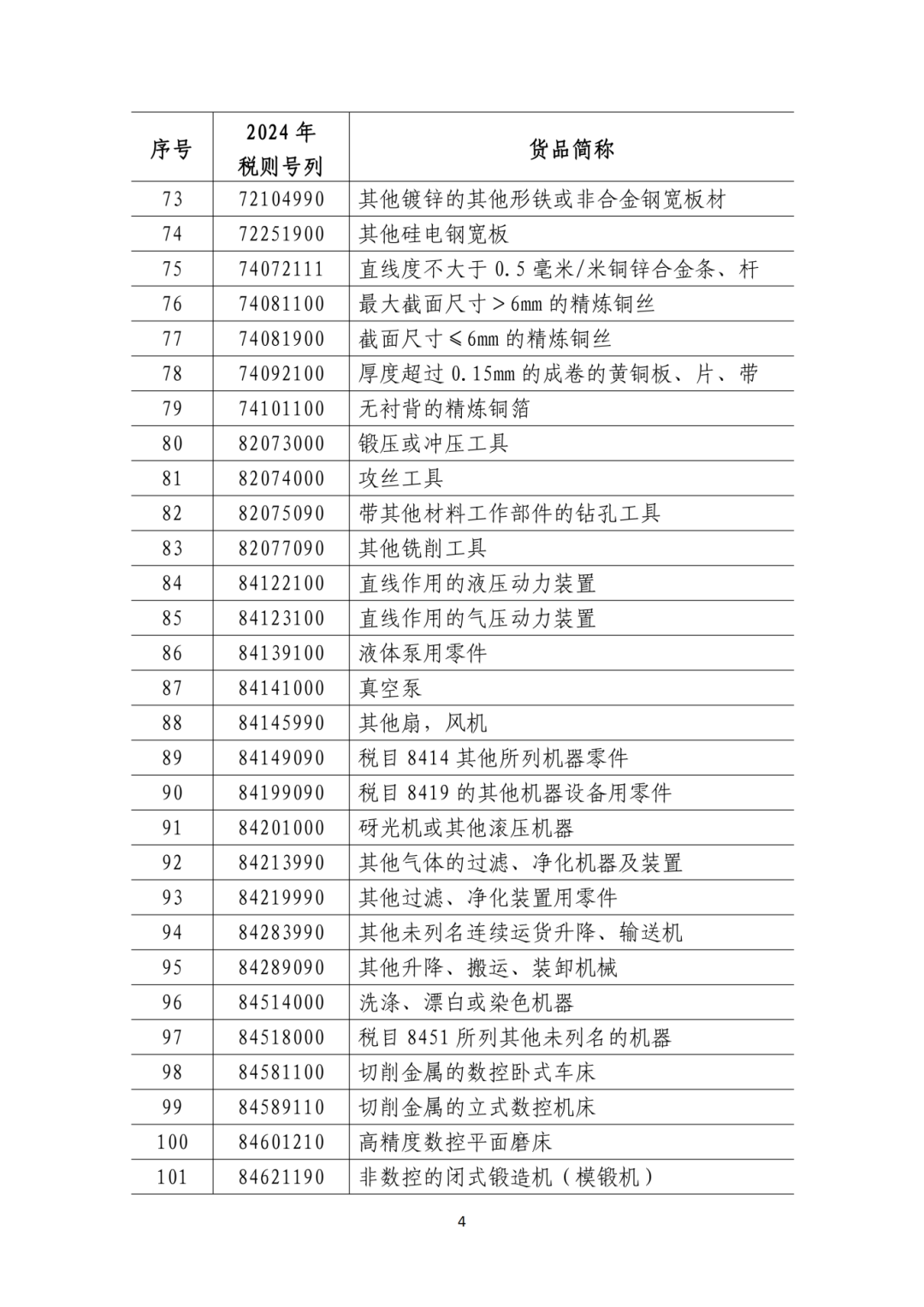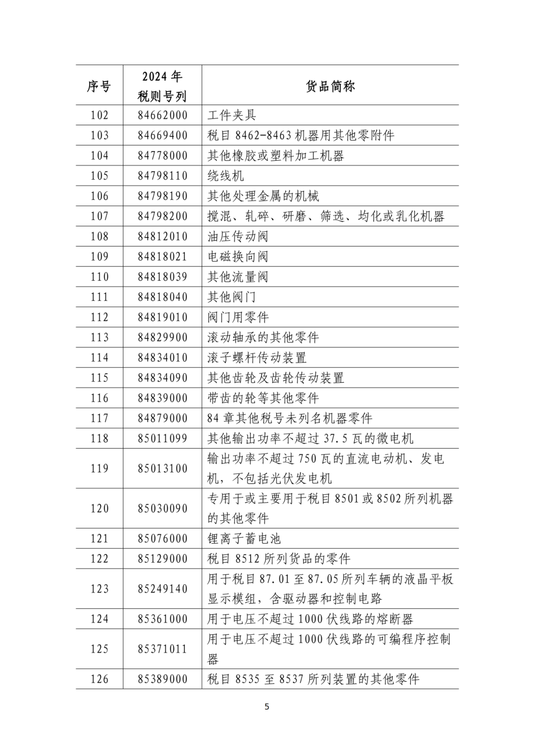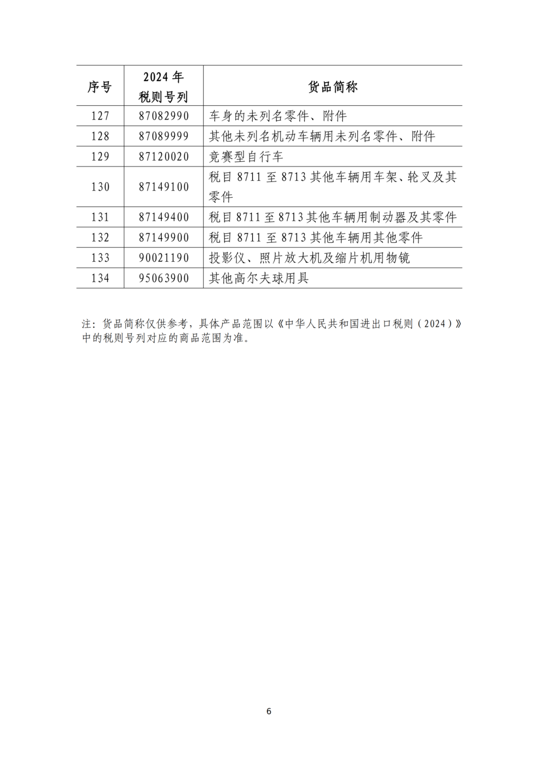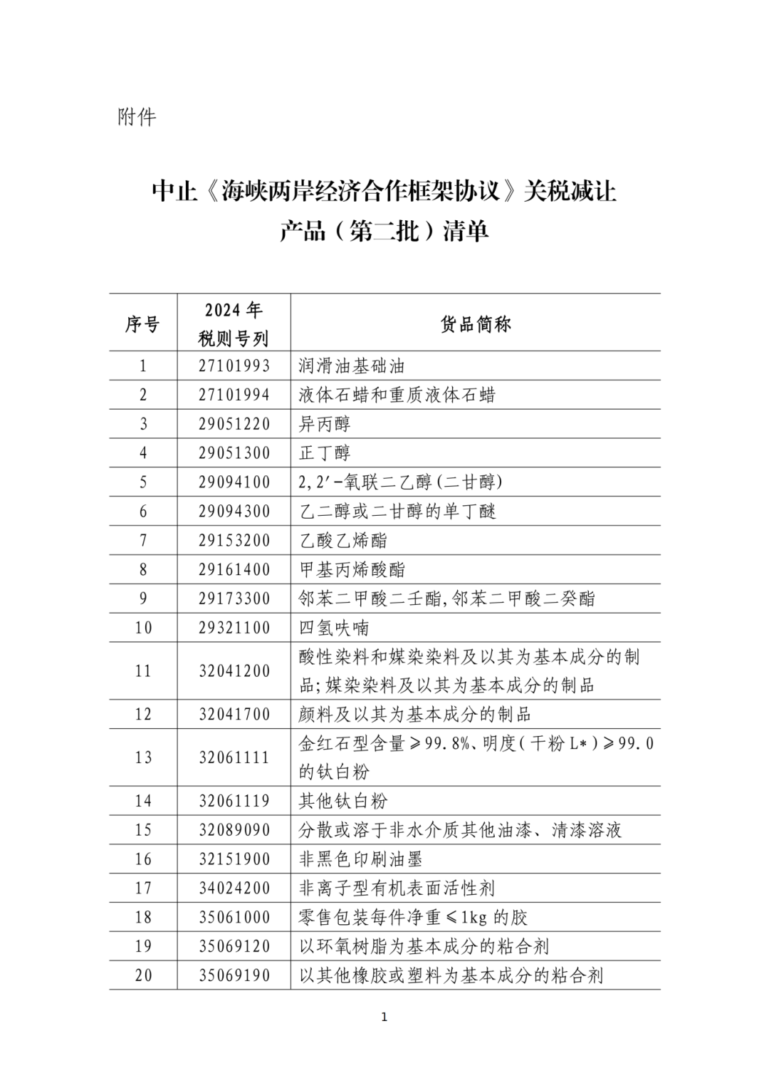 自2024年6月15日起,对原产于台湾地区的附件所列润滑油基础油等134个税目进口产品,中止适用《海峡两岸经济合作框架协议》协定税率,按现行有关规定执行。