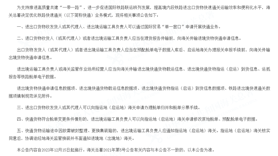 关于优化铁路快速通关业务模式的公告