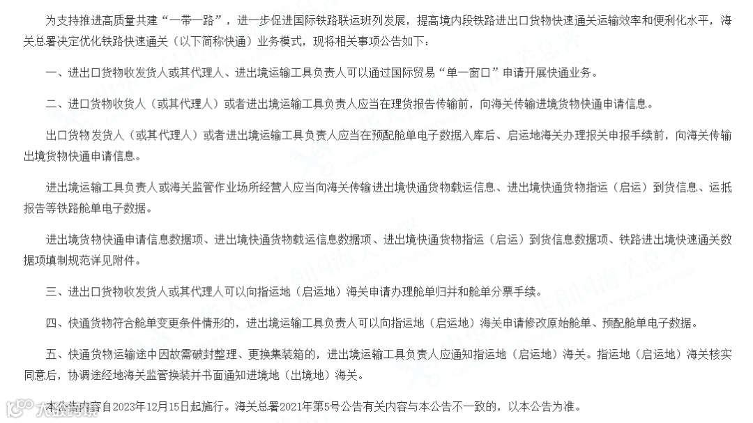 2、优化适用主体:铁路快通业务申请主体由“铁路运营企业”调整为“进出口货物收发货人或其代理人”、“进出境运输工具负责人”。