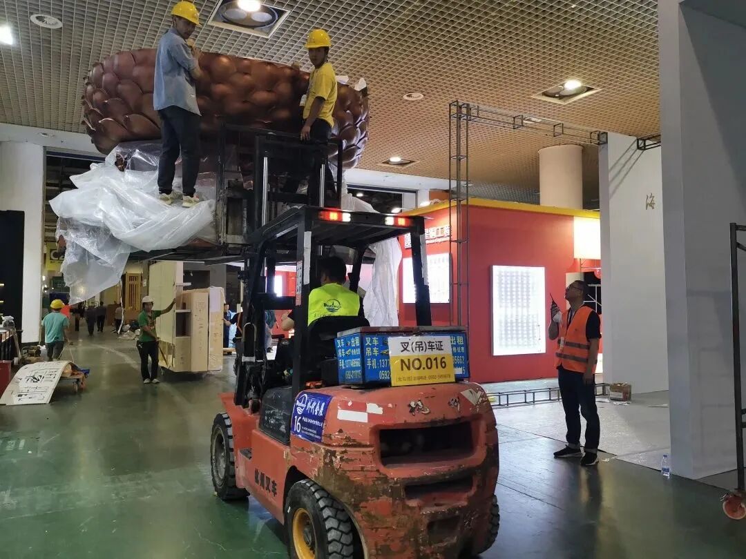 展厅内外,十几辆叉车和吊车在工作人员的指挥下有序作业。工作人员来回奔走于各个展厅,主动与抵达展厅的参展商沟通交流,根据展商的要求检查、清点每一件参展货物;按照展台的布展规范及展会设置要求,指挥叉车运作,将佛雕等大件展品有序地摆放在指定展位。