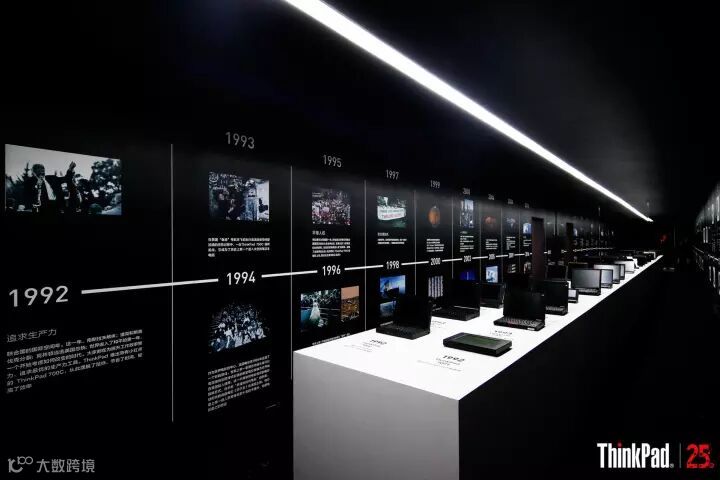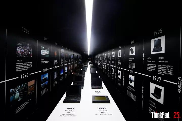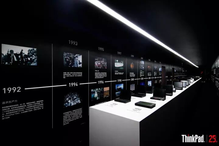 踏入展厅的大门,右手边即是“时间走廊”。时间走廊以1992-2017为线,一款款经典产品,一串串记录经典的数字,一段段不可磨灭的记忆,仿佛打开一副历史长卷展示在眼前。沿着这条走廊,不仅能看到人类前进的步伐,还能看到ThinkPad 作为经典PC,对创新和领先科技的思考。