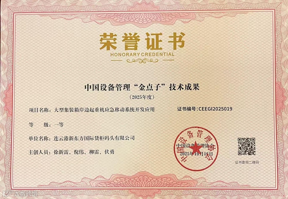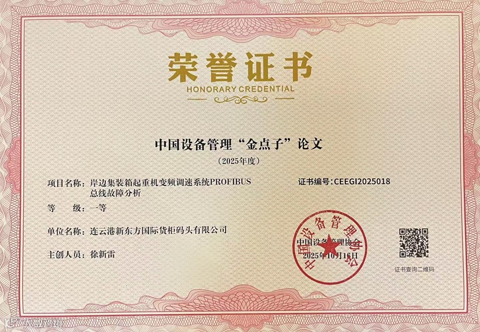 连云港货柜码头凭借技术创新成果从中脱颖而出,斩获三项重量级荣誉。其中,“大型集装箱岸边起重机应急移动系统开发应用”项目创新采用“辅助变压+变频器+电机”方案,破解码头大型岸桥缺乏自主应急移动系统的行业痛点,荣获“金点子”技术成果一等奖;公司技管部专家级工程师徐新雷个人表现突出,其论文《岸边集装箱起重机变频调速系统 PROFIBUS 总线故障分析》,深入剖析桥吊变频调速系统总线故障并给出解决方案,荣获“金点子”论文一等奖;同时,他因技术贡献获评“金点子” 标杆人物奖。据悉,徐新雷近3年主持参与项目获集团级以上荣誉20余项,6次获集团级以上论文奖,是公司数智化转型的核心技术带头人。