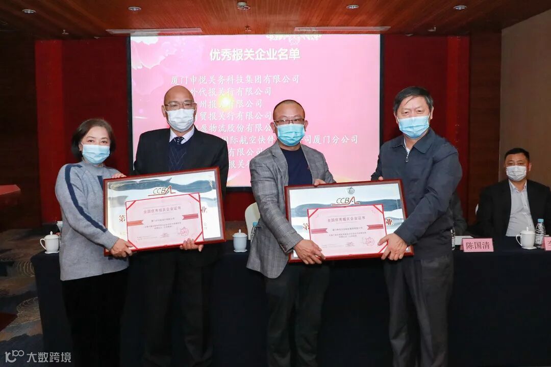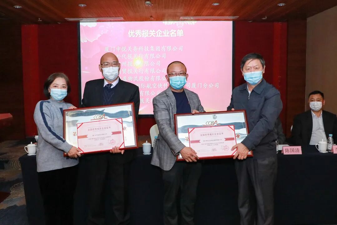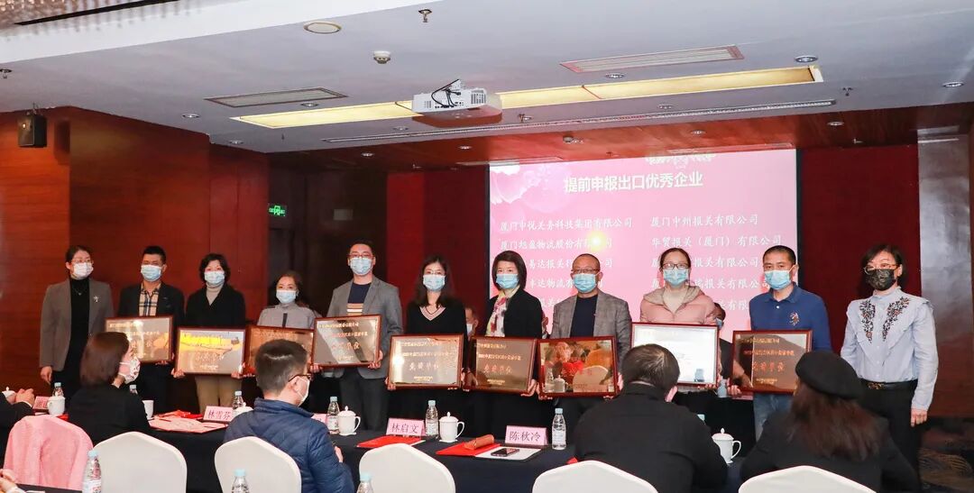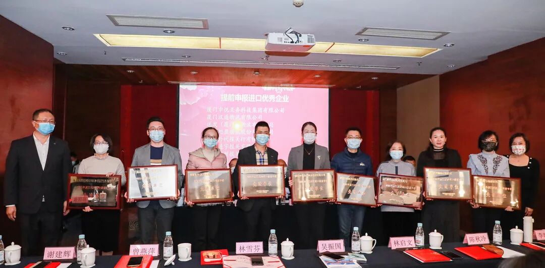 厦门外代报关行有限公司荣获多项荣誉表彰,包括“全国优秀报关企业”、“2021年厦门关区进口提前申报先进单位”、“2021年厦门关区出口提前申报先进单位”三个奖项,关务总监周伟仪上台接受授牌仪式。