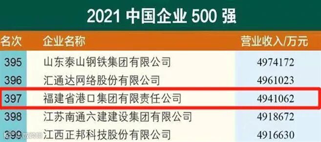9月25日,中国企业联合会、中国企业家协会发布了“2021中国企业500强”榜单。福建港口集团成立首年即入围中国企业500强,位居第397位,同时集团在中国服务业企业500强中位列第147位。