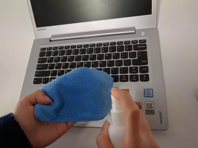 然后把清洁液喷洒在清洁布上,使用清洁布擦拭键盘表面灰尘。