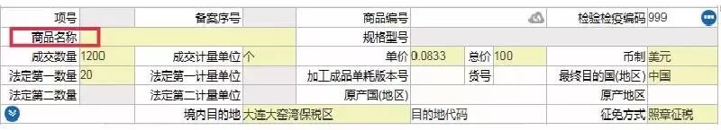 该项目为原报关项目 “商品名称” 和原报检项目的“货物名称”,现合并为“商品名称”。