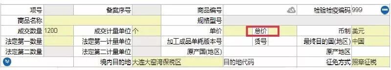录入成交数量、成交单位、单价后,总价会自动生成。例如:某进口商品,录入成交数量1000,成交单位为千克(代码0.35),单价10,总价则会自动生成10000。