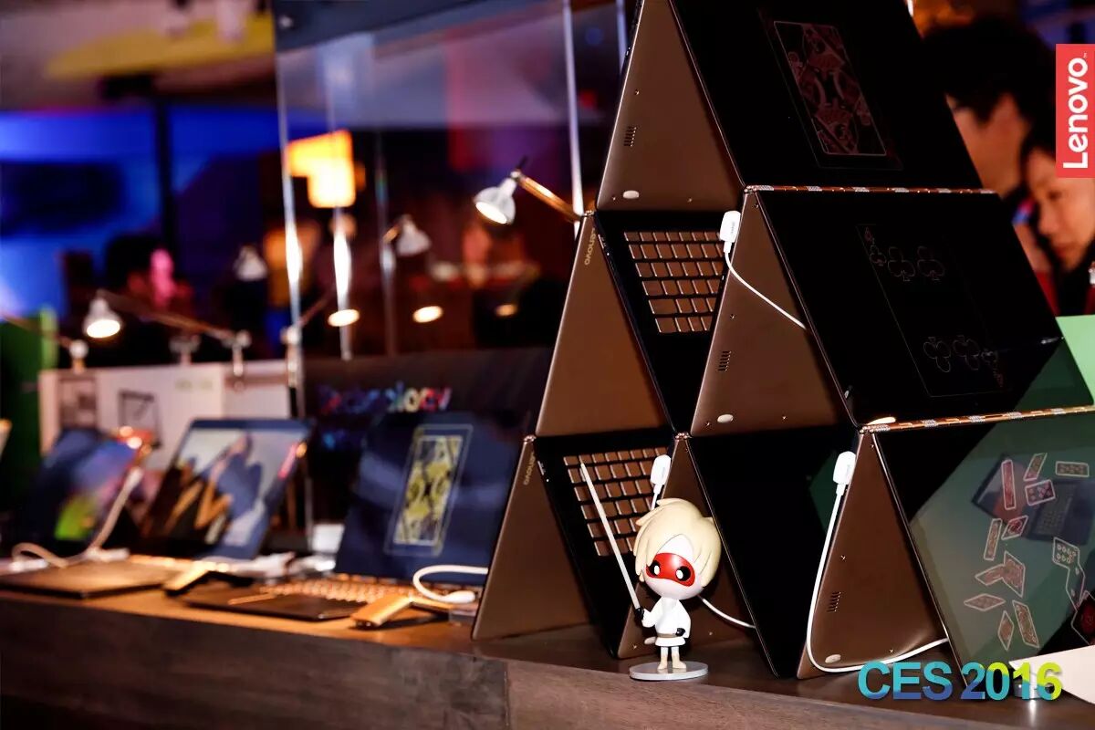 ▼然后映入眼帘的好像是一座...闪闪发亮的金字塔?我定睛一看,原来是由六台YOGA 4S(YOGA 900S)搭成的。这款全球最薄的多模式笔记本厚度仅为12.8毫米,重量999g,保留了813个零件打造的独特表链转轴设计,360°顺滑翻转毫无压力。
