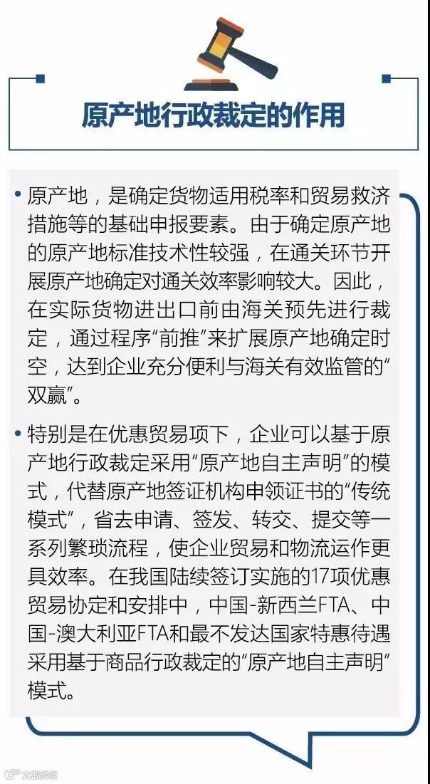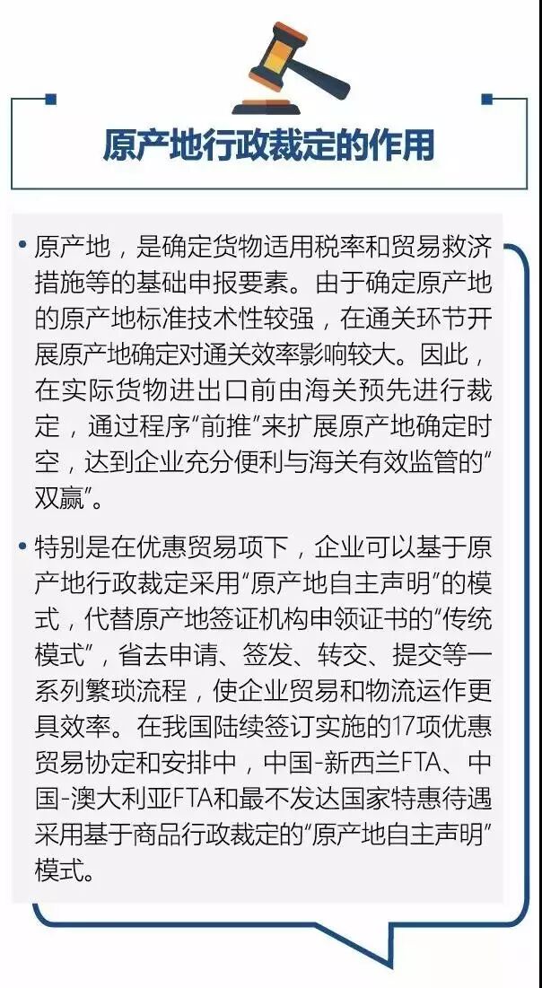 该裁定是我国实施海关行政裁定制度以来首票原产地行政裁定,也是继归类行政裁定实施后,又一项行政裁定制度落地。
