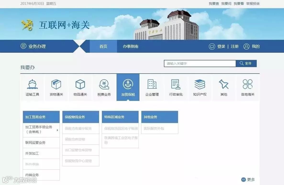 其中“我要办”可包括运输工具、货物通关、物品通关、税费业务、加贸保税、企业管理、行政审批、知识产权等。