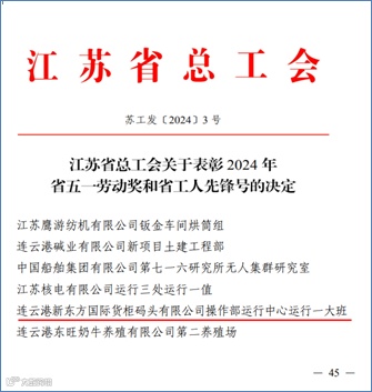 为表彰先进、树立榜样,在全社会弘扬劳模精神、劳动精神、工匠精神,近日,江苏省总工会公布了2024年省五一劳动奖和省工人先锋号名单,其中,连云港新东方国际货柜码头有限公司操作部运行中心运行一大班被授予省工人先锋号,也是本年度连云港港口唯一获此殊荣的班组。