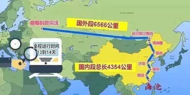 该班列自厦门始发后,途径南昌-南京-济南-锦州-满洲里-后贝加尔-莫斯科昆采沃,其中国内段总长4354公里,国外段6566公里,全程运行时间约14天。