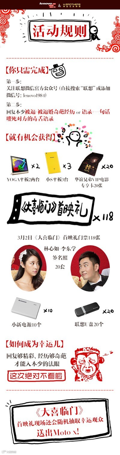 参与活动的小伙伴们可以在28日14:00后给本少回复“查询吐槽获奖”,查看自己的获奖情况。以上活动将在联想官方微信、联想官方微博、华谊兄弟官方微博同步进行,奖品池为三个平台共有并统一分配,所有中奖信息也会在各平台统一公布。