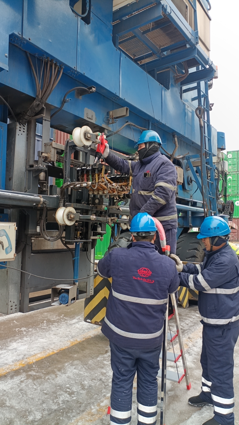 在现场,设备维修人员迅速展开了工作。一部分人先对设备进行了仔细的检查,认真细致地检查每一个部件,不放过任何一个可能存在的隐患。当发现场桥滑触线取电小车碳刷处结冰严重,码头岸桥电缆坑排水孔和大车锚定坑结冰时,立即取来暖风枪对结冰严重处加热,用铁棍疏通排水孔。另一部分人则拿起了扫帚和铁锨等必要工具,参与到码头扫雪除冰行列之中。尽管天气寒冷,但大家的工作热情却丝毫不减,对于出现故障的设备,迅速进行维修,以最短的时间恢复正常运行。在这个过程中,不仅要面对严寒的挑战,还要克服各种困难。有时需要在结冰的路面上行走,小心翼翼地避免滑倒;有时需要在严寒中登高作业,确保维修工作的质量和安全。经过一上午的努力,大家终于完成了任务,脸上露出了欣慰的笑容,尽管手和脸都被冻得通红,但我们的心中却充满了成就感。